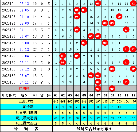 石浩第2025134期大乐透后折柳析:后区上周星期一后区奖号为09和12,上期开出奖号07和11,最近9周星期一与最近9期后区奖号奇偶比齐为9:9,大小比分别为12:6和11:7,本期瞻望后区开出全奇组合,参考号码05、07、09、11。