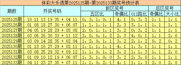 体彩大乐透第2025133期奖号为04 11 23 27 35 + 07 11,前区号码五区比为1:1:0:2:1,奇偶比为4:1,012路比为1:1:3,后区号码奇偶比为2:0,大小比为2:0。
