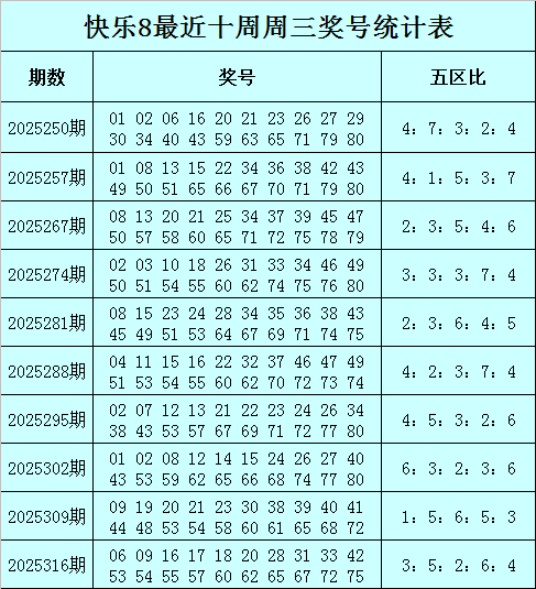 福彩欣慰8第2025316期(上周三)开奖总结:06 09 16 17 18 20 28 31 33 42 53 54 55 57 60 62 65 67 72 75,其中奖号五区比为3:5:2:6:4。