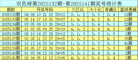 第2025141期双色球奖号开出:02、04、05、10、12、13 + 06,红球奇偶比为2:4,三区比为4:2:0,大小比为0:6。