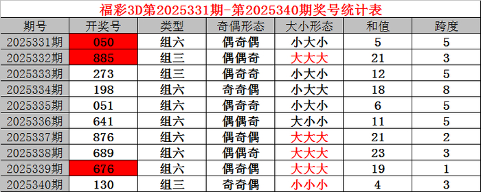 上期转头:福利彩票3D第2025340期开奖恶果130。奖号:奇奇偶、小小小,和值4,跨度3。