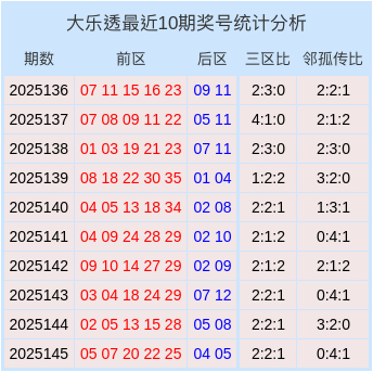 上期奖号中三区比为2:2:1,邻孤传比为0:4:1。