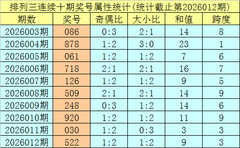 上期回想:摆设三第2026012期奖号:522。类型:组三,奇偶口头:奇偶偶,大小口头:大小小,和值:9山西天辰装饰工程有限公司,跨度:3。